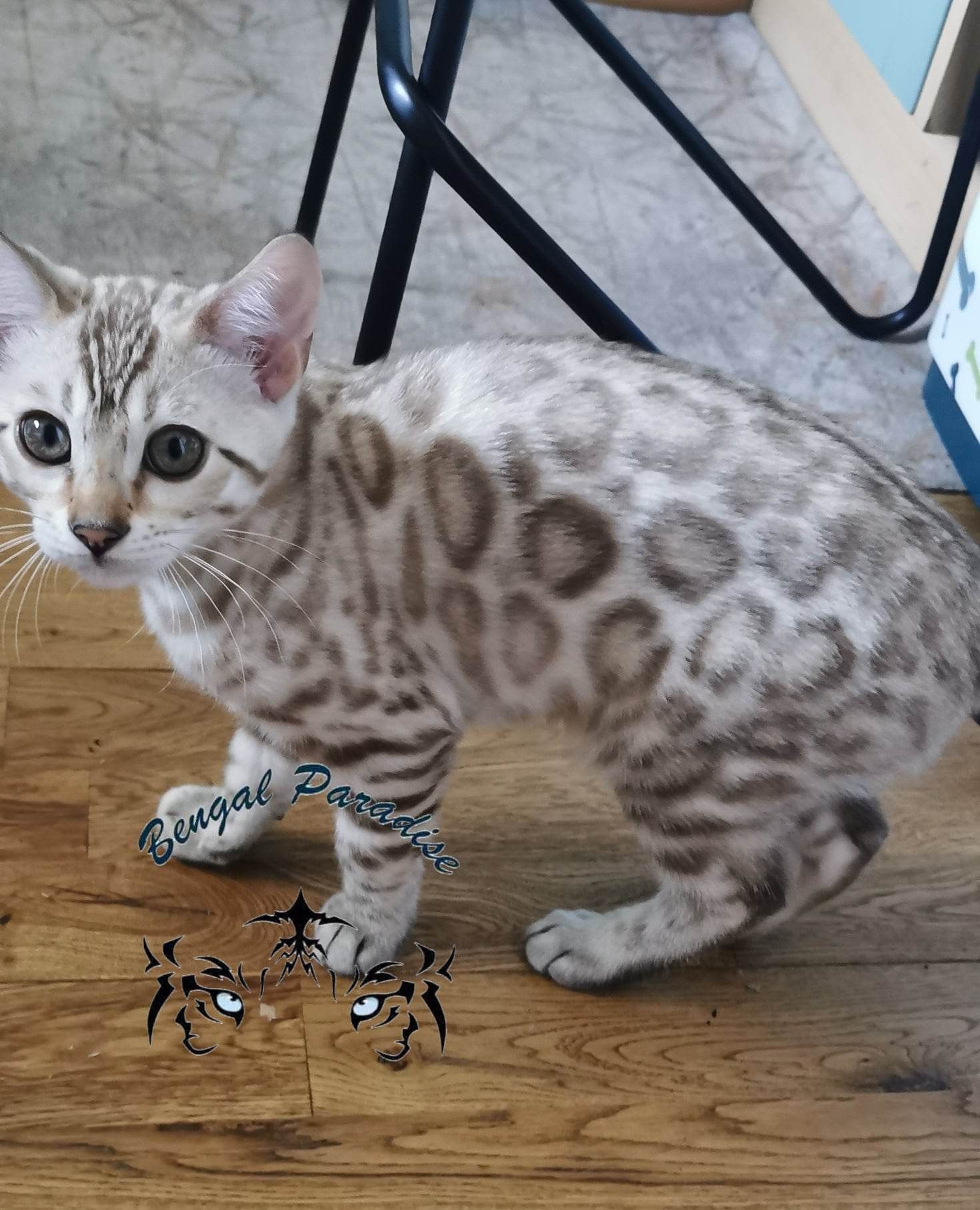 BENGALPARADISE Queen AQUAAMBERLEO ADA DIOR born in our BENGALPARADISE kennel 19/05/2021.Dad is from Lithuania HUGO LUXURY LEX OF LAIMES PUKELIS kennel & mum is GCH KUBERA KLEOPATRA. ADA DIOR is Broad medium wedge with rounded contours, slightly longer than it is wide and high cheek bones. Head small in proportion to body. Profile curves gently from the forehead to the bridge of the nose, the bridge of the nose extends to nose leather to a very slight concave curve, large nose with a slightly puffed nose leather. Strong muzzle and pronounced whisker pads. Medium ears, rounded tips and set well. Eyes hazel coloured ,almost round. Good body confirmation, long and sleek, good muscle tone. Proportionate limbs and tail of thick medium length well ringed ending in a rounded tip. Broken and unbroken necklets. Clear facial markings. Lines and spots on legs. Defined black rosettes on buff contrasting background colour on coat of good length, soft and dense. ADA DIOR is young, wonderful mother, we are happy to keep her in our BENGALPARADISE cattery.